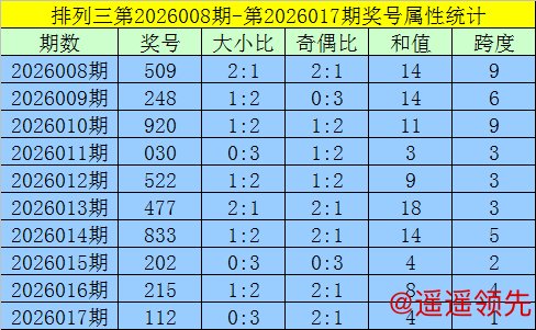 上期回顾:排列三第2026017期出现奖号112。开出组三,奇偶比2:1,012路比0:2:1,大小比0:3,和值4,跨度1。