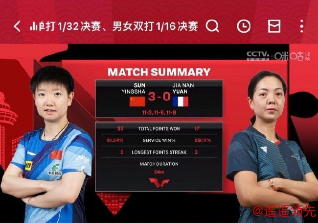 当日最后出场孙颖莎同样只用时24分24秒,以3-0(11-3/11-6/11-8)横扫法国华裔选手袁嘉楠,取得开门红。比赛中,首局,袁嘉楠开场后曾一度3-2领先,但莎莎打出一波9-0,很快以11-3先声夺人。第二局,孙颖莎开局4-1领先,袁嘉楠追成4平后,莎莎又是连得5分拉开分差,并以11-6再胜一局。第三局,孙颖莎开局3-0领先,袁嘉楠叫暂停。暂停归来,孙颖莎牢牢占据领先位置,并把分差进一步拉开到9-5,最终以11-8锁定胜局。