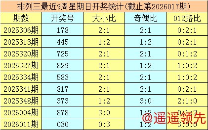三、体彩排列三前9周星期日奖号分别开出:178-445-725-829-583-817-373-878-030,k彩娱乐官网其中号码012路比为7:9:11,奇偶比为15:12,大小比为15:12;